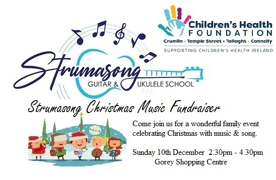 We did it !!!! Strumasong Guitar & Ukulele School raise €1025 for Children's Health Foundation Temple Street. Well done to the wonderful Strumasong Guitar & Ukulele School musicians and singers who entertained everyone at Gorey Shopping Centre on Sunday, 10th December. Thank you for all the generous donations from shoppers and onlookers on the day, we had set a target of one thousand euro and we are super delighted to excede it. Happy Christmas from all at Strumasong Guitar & Ukulele Sch ool